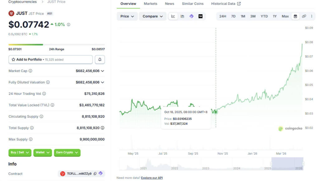 JST's market performance is another powerful validation of this deflationary logic. According to CoinGecko's data, since the buyback program commenced in October 2025, JST's price has surged from a low of ~$0.03 to $0.08, representing an over 100% upsurge. Over the same period, its market cap has jumped from $300 million to ~$700 million, signaling robust investor confidence. As this deflationary mechanism becomes a structural fixture of the ecosystem, the ongoing contraction of circulating supply is expected to drive JST's valuation up in the long run.