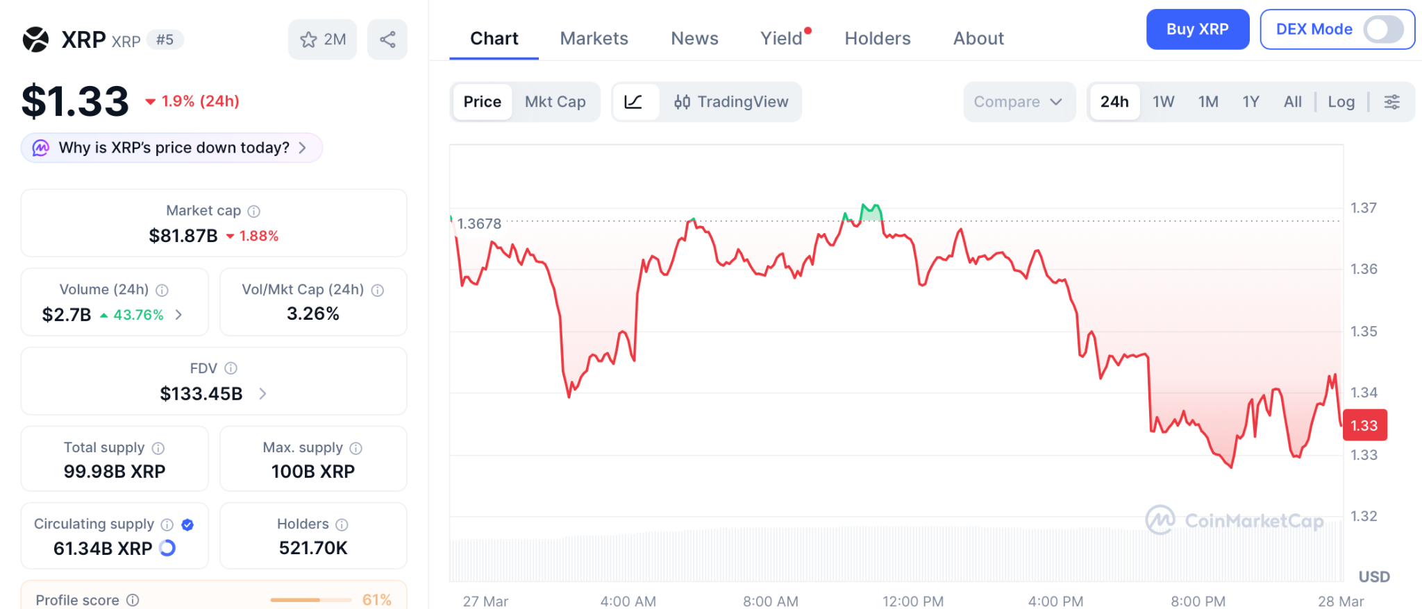 Its 24-hour trading range of $1.34 to $1.39, according to CoinGecko, shows the tight, directionless price action that has persisted for much of March.