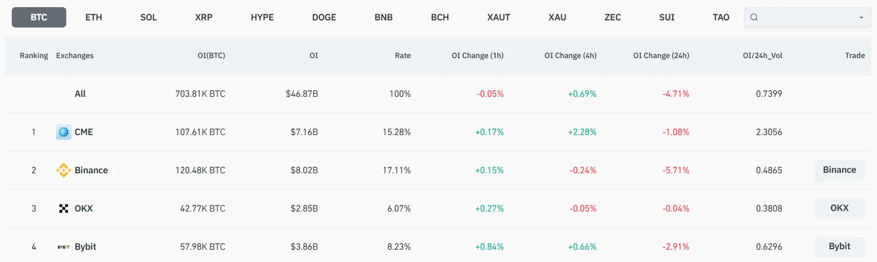 According to CoinGlass analytics, aggregate BTC futures open interest contracted 2.5% to $46.49 billion within just four hours post-speech. CME open interest decreased 2.70% while Binance witnessed a 2.96% drop. Such movements generally indicate traders liquidating or closing long positions.