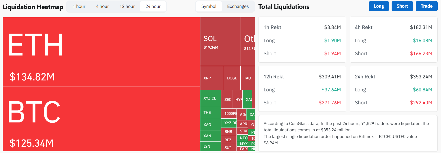 Notable gains are evident from ADA (10%), DOT (12%), PEPE (15%), ETC (9%), and others. The total value of wrecked positions has risen to $350 million, according to CoinGlass, with nearly $300 million coming from shorts. Interestingly, ETH shorts are responsible for the largest portion, followed closely by BTC’s.